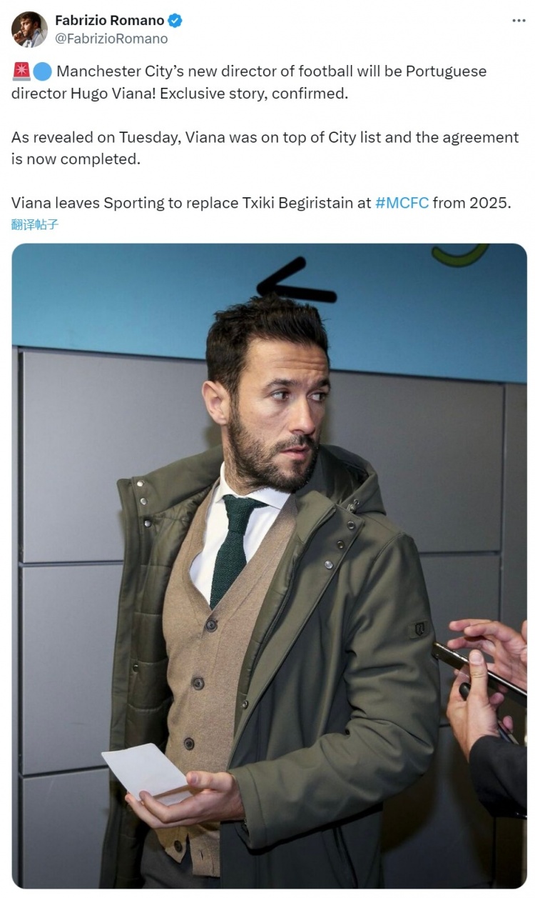 据知名记者罗马诺透露,维亚纳将成为曼城新任足球总监,双方已经就此达成协议。