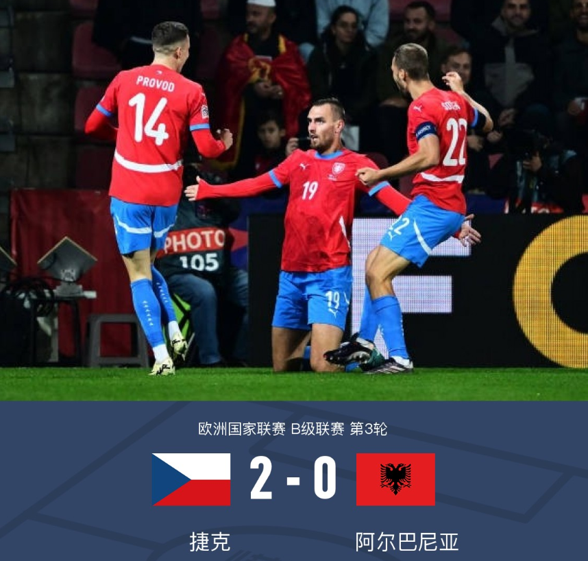 在欧洲国家联赛B级联赛的较量中,捷克队迎战阿尔巴尼亚队。比赛中,捷克的托马斯-绍里表现出色,成功打入两球,展现了他出色的进攻能力。曹法尔也在比赛中贡献了一次精彩的助攻,帮助托马斯-绍里再下一城。最终,捷克队以2-0的比分战胜了阿尔巴尼亚队。