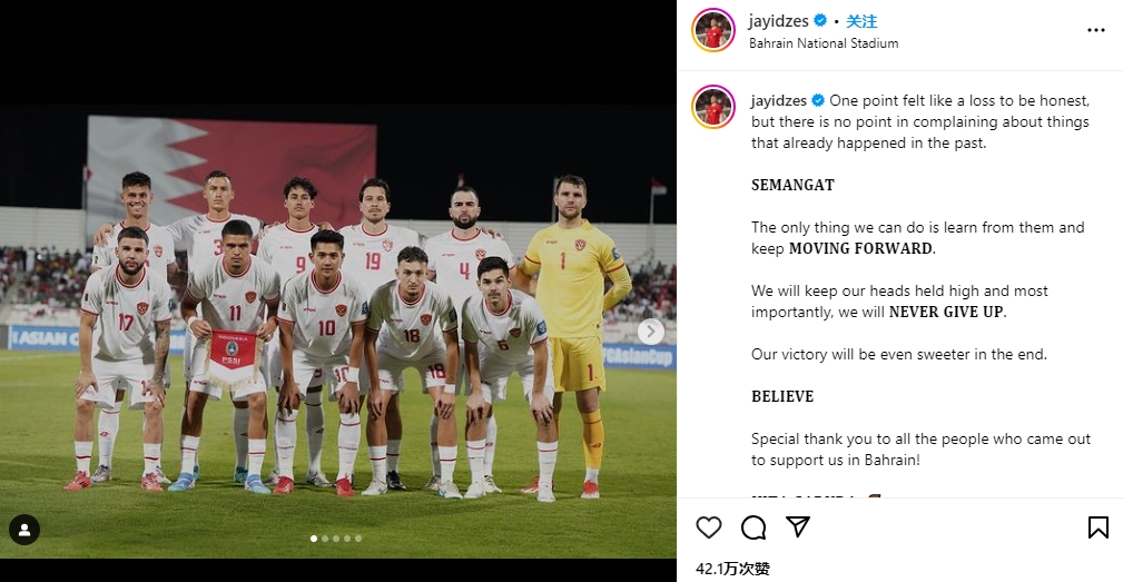 今日,印尼队后卫伊泽斯在社媒晒出上轮与巴林的比赛照等,表达了未取胜的遗憾,以及接下来的展望。