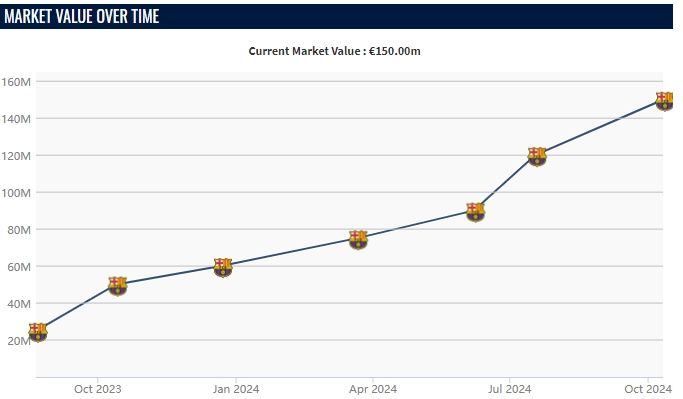 亚马尔首秀时身价未定,2023年8月被德转定为2500万欧,2024年7月涨到1.2亿欧,不到一年暴涨近1亿。而在最近的一次身价更新中,17岁的亚马尔已经达到1.5亿欧身价,排名世界第五。