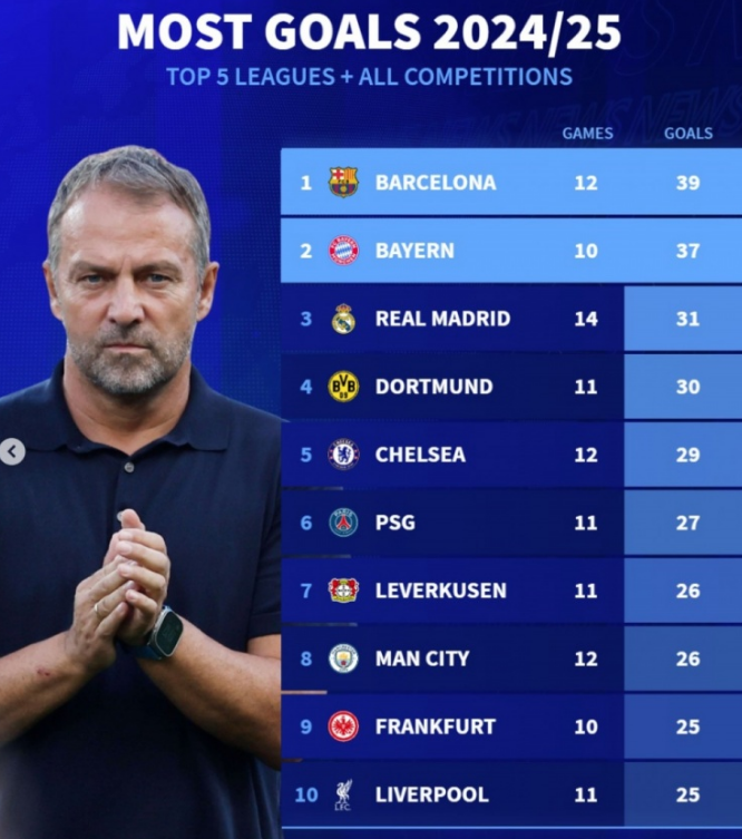 10月23日讯 巴萨将在本轮欧冠焦点战主场迎战拜仁,《转会市场》统计显示两队也是本赛季五大联赛各项赛事总进球前二的球队。