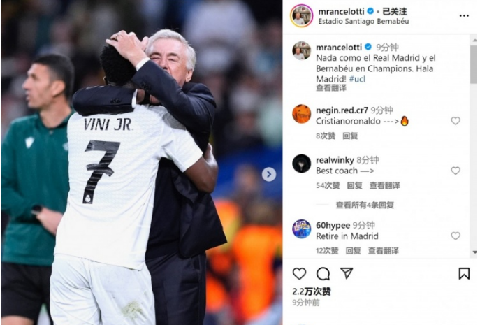 赛后皇马主帅安切洛蒂在社交媒体上晒出与维尼修斯拥抱的照片,并写道:“欧冠的皇马和伯纳乌独一无二,Hala Madrid!”