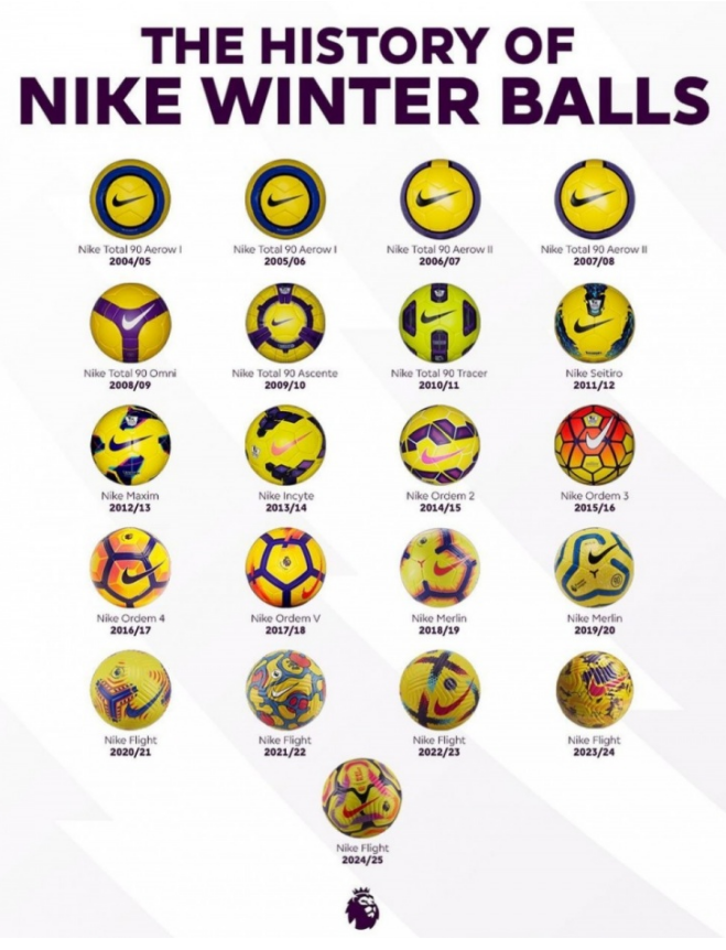 英超自2004-05赛季开始引入冬季用球,每一代的英超冬季用球都是用高亮黄色为主色。