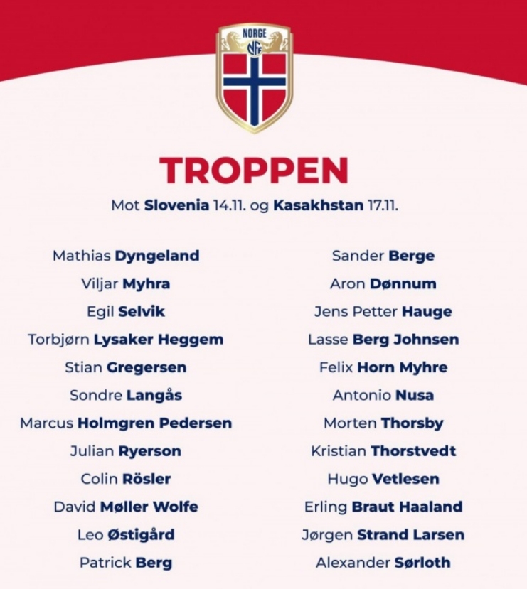 中前场:帕特里克-伯格(博德闪耀)、桑德-伯格(富勒姆)、多努姆(图卢兹)、海于格(博德闪耀)、伯格-约翰森(马尔默)、迈尔(布兰)、努萨(莱比锡)、托斯比(热那亚)、托斯特维特(萨索洛)、维特勒森(布鲁日)、哈兰德(曼城)、拉尔森(狼队)、索尔洛特(马竞)