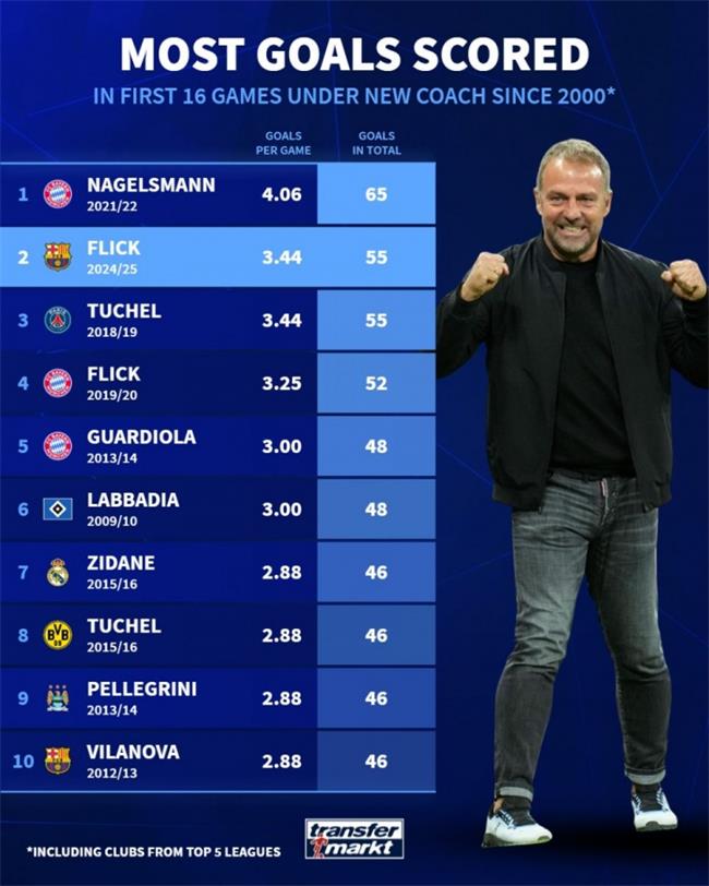 德国转会市场统计了本世纪教练执教五大联赛球队前16场的进球数量,并列出榜单,纳帅执教拜仁65球居首,弗里克执教巴萨、图赫尔执教巴黎55球次席。