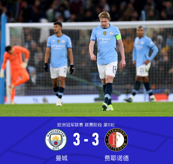 在一场激动人心的欧洲冠军联赛对决中,曼城与费耶诺德展开了一场精彩的较量。上半场,哈兰德造点并亲自主罚命中。下半场,京多安建功。努内斯助攻,哈兰德铲射再下一城。不过接下来风云突变,格瓦迪奥尔送礼,阿尼斯-穆萨扳回一城。希门尼斯和汉茨科随后接连得分帮助费耶诺德扳平比分。全场比赛结束,曼城主场连丢3球3-3战平费耶诺德,在各项赛事中连续6场不胜。