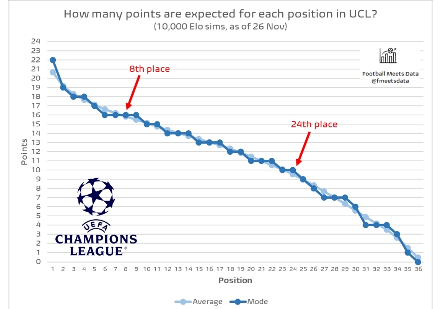 欧冠新赛制已经进行到中段,超级计算机通过1万次模拟,预测了本赛季欧冠最终出线门槛。