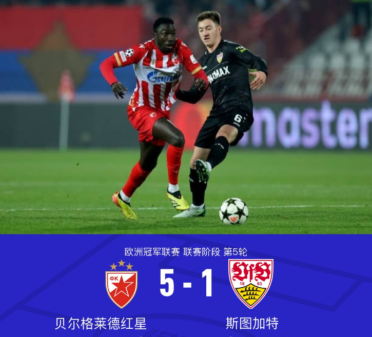 在欧洲冠军联赛小组赛的一场精彩对决中,贝尔格莱德红星迎战斯图加特。比赛伊始,斯图加特的德米罗维奇在队友米约的助攻下率先破门,为球队取得领先。然而,贝尔格莱德红星迅速做出回应,姆武帕为球队扳平比分。随后,贝尔格莱德红星展现出强大的进攻火力。克鲁尼奇在薛英佑的助攻下成功破门,帮助球队反超比分。接着,伊万尼奇在埃尔什尼克的助攻下再下一城,进一步扩大了领先优势。比赛进入尾声阶段,贝尔格莱德红星的拉多尼奇表现出色,先是在克鲁尼奇的助攻下破门得分,随后又在埃尔什尼克的帮助下完成梅开二度,锁定胜局。最终,贝尔格莱德红星以5-1的大比分战胜斯图加特,展现了强大的团队实力和出色的进攻能力。