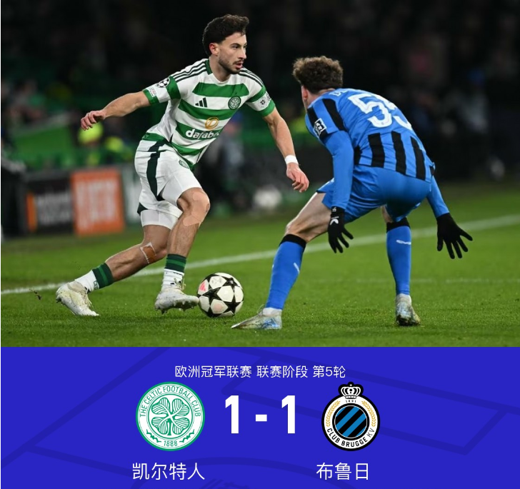 在欧洲冠军联赛小组赛的一场较量中,凯尔特人与布鲁日展开对决。比赛中,凯尔特人球员卡特-维克斯不慎将球打入自家球门,给对手送上了一份大礼。然而,凯尔特人并未因此气馁,阿莱士-巴列送出精妙助攻,前田大然抓住机会,为球队扳平比分。最终,双方以1-1握手言和。
