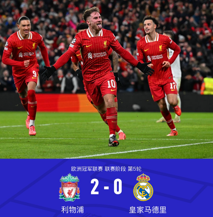 欧冠联赛阶段第5轮,利物浦2-0皇马,姆巴佩、萨拉赫失点,加克波、麦卡利斯特破门。