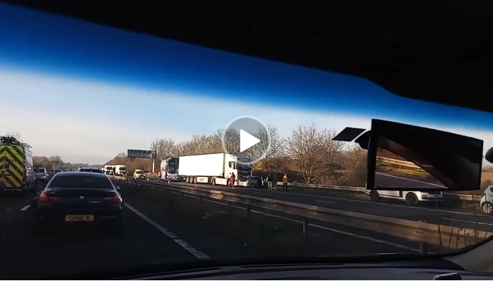 11月28日讯 据多位英国网友拍摄的视频显示,皇马大巴在英国M40公路上遭遇车祸,追尾了一辆货车。