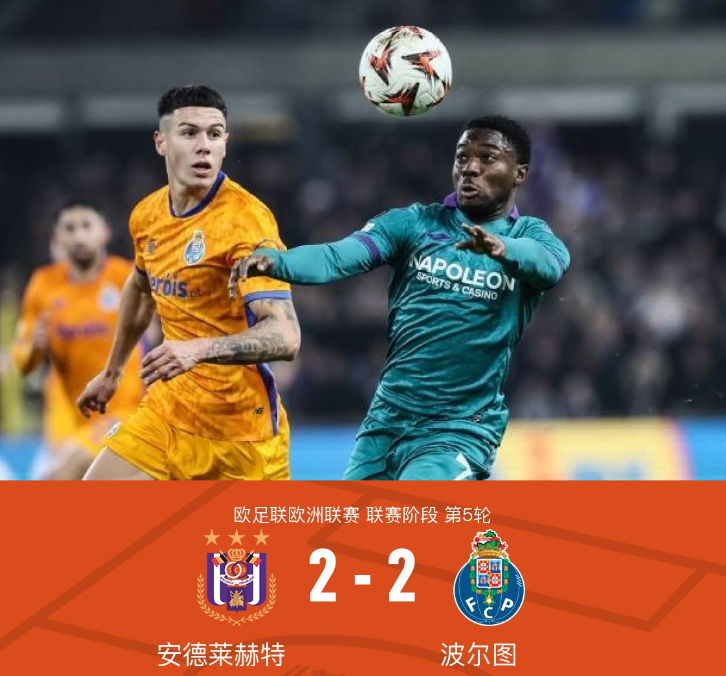 在欧足联欧洲联赛的较量中,安德莱赫特与波尔图展开了一场激烈的对决。比赛中,波尔图的加莱诺率先通过点球为球队取得领先。随后,安德莱赫特的里茨送出精妙助攻,德赫雷夫成功将比分扳平。比赛接近尾声时,波尔图的尼科-冈萨雷斯助攻法比奥-维埃拉,再次为球队取得领先。然而,安德莱赫特并未放弃,穆萨-恩迪亚耶助攻阿穆祖,帮助球队再次扳平比分。最终,双方以2-2握手言和,奉献了一场精彩的比赛。