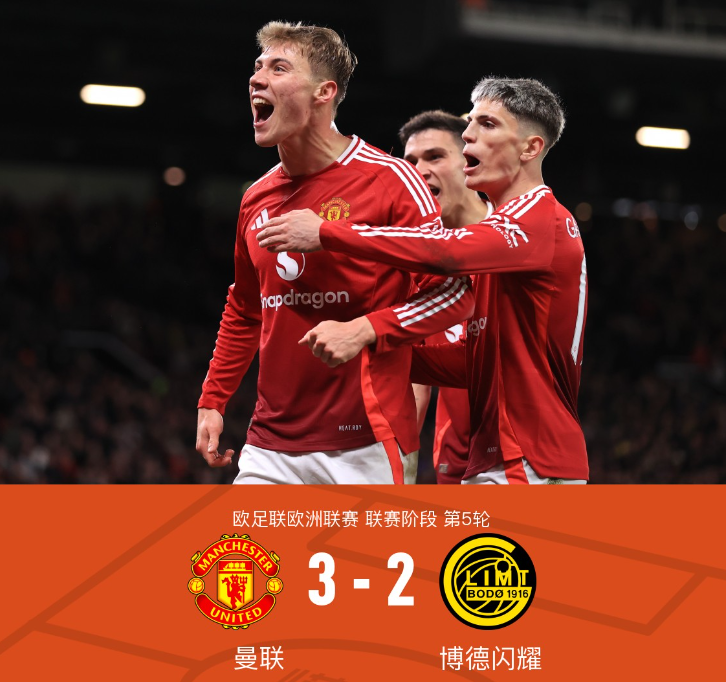 在欧足联欧洲联赛的较量中,曼联与博德闪耀展开了一场激烈的对决。上半场加纳乔闪击破门,埃夫连世界波扳平,辛克尔纳格尔生吃马拉西亚反超比分,霍伊伦禁区抽射扳平,下半场霍伊伦门前推射梅开二度,加纳乔屡失良机,奥纳纳多次扑救。最终,曼联以3-2险胜博德闪耀,取得了这场比赛的胜利。