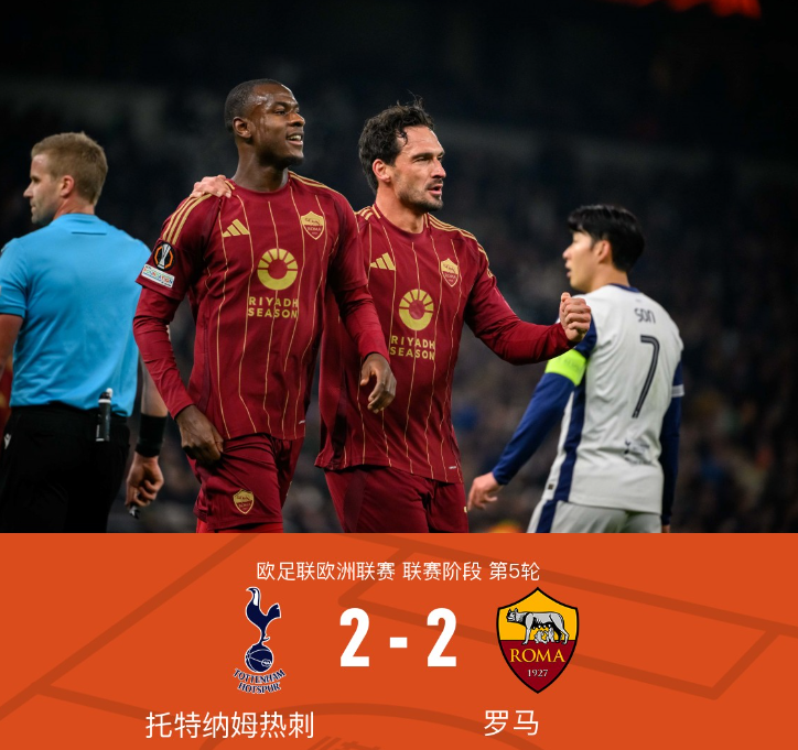 孙兴慜点射,胡梅尔斯送点+补时绝平,热刺主场2-2战平罗马。