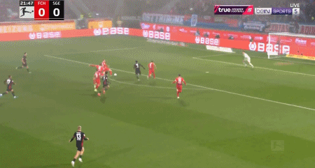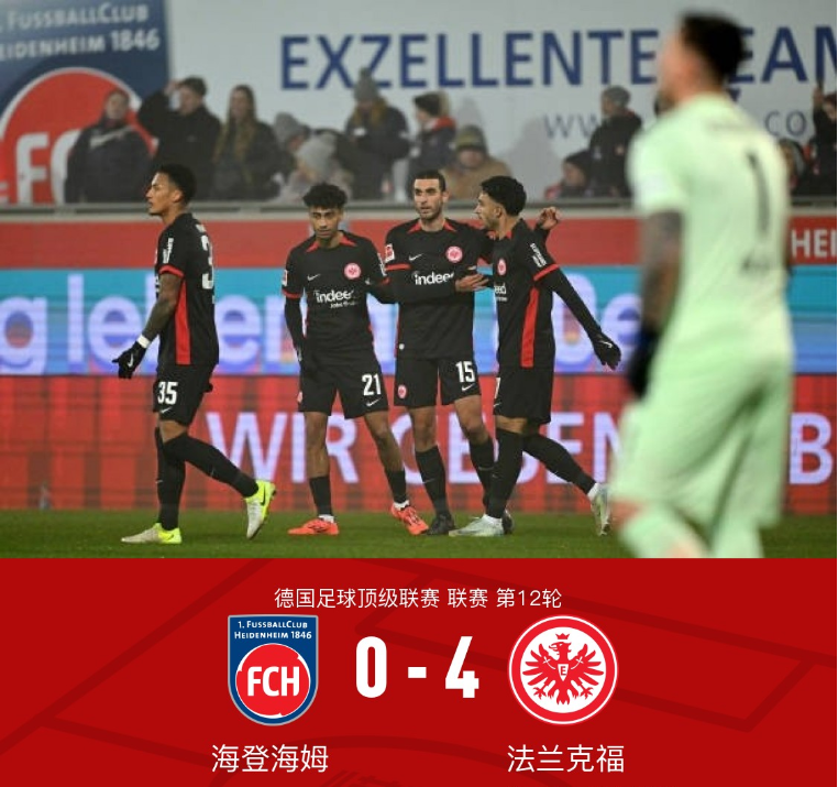第90+4分钟,埃基蒂克破门锁定比分,法兰克福4-0海登海姆