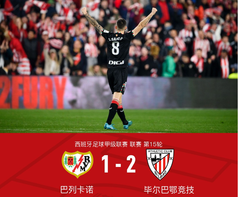 在西班牙足球甲级联赛第15轮的较量中,巴列卡诺坐镇主场迎战毕尔巴鄂竞技。比赛中,巴列卡诺的恩特卡率先为球队取得进球。然而,毕尔巴鄂竞技的桑切特表现出色,凭借队友尼科-威廉斯和德马科斯的助攻,成功打入两球,帮助球队逆转局势。最终,毕尔巴鄂竞技以2比1战胜巴列卡诺。