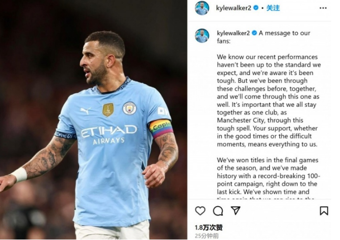 12月2日讯 最近一场英超,曼城0-2不敌利物浦。曼城后卫沃克发表公开信就球队近期表现不佳致歉,承诺将继续为目标而战。
