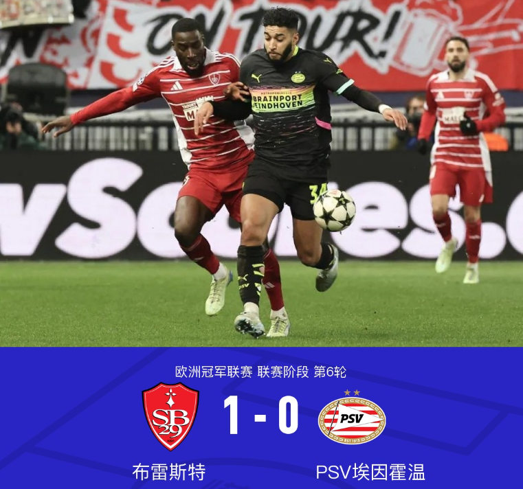 在欧洲冠军联赛的较量中,布雷斯特迎战PSV埃因霍温。比赛中,布雷斯特的勒卡迪纳尔表现出色,为球队打入关键一球。最终,布雷斯特以1比0战胜PSV埃因霍温,取得了比赛的胜利。