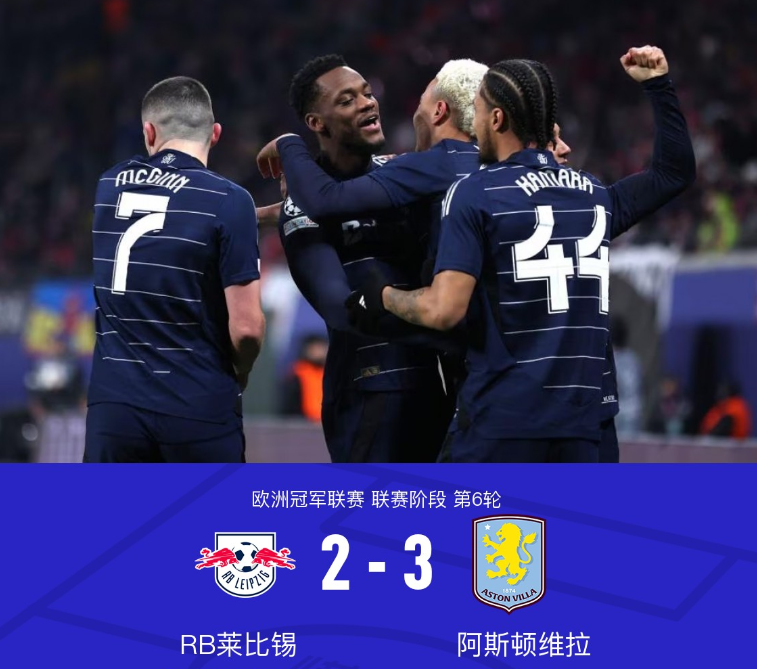 在欧洲冠军联赛的激烈对决中,RB莱比锡迎战阿斯顿维拉。上半场麦金闪击破门,奥蓬达推射空门扳平,下半场杜兰禁区外远射得分,随后杜兰破门被吹越位,鲍姆加特纳推射扳平,巴克利幸运绝杀。最终,阿斯顿维拉以3比2险胜RB莱比锡。
