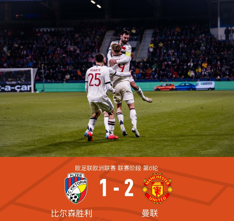在欧足联欧洲联赛的较量中,比尔森胜利迎战曼联。上半场双方进攻机会寥寥,B费外围一记远射被扑制造了险情。下半场时奥纳纳低级失误送出大礼,维德拉推射破僵先拔头筹,霍伊伦直面门将的机会一脚低射被门将抱住,随后迪亚洛禁区突破推射被扑后,霍伊伦跟进补射破门将比分扳平,比赛进入到尾声阶段,B费战术定位球助攻霍伊伦梅开二度逆转胜局,随即全场战罢,最终,曼联以2比1逆转战胜比尔森胜利。