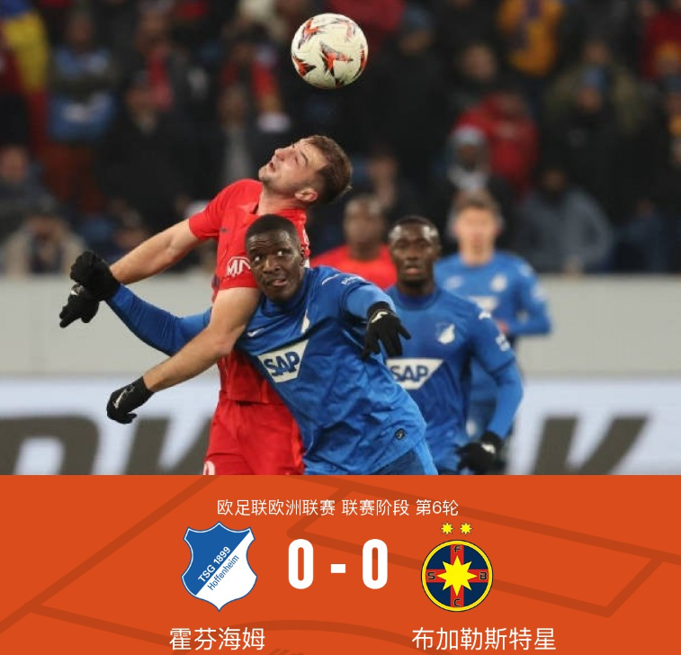 在欧足联欧洲联赛的较量中,霍芬海姆迎战布加勒斯特星。经过激烈的对抗,双方均未能攻破对方球门,比赛以0-0的比分结束。两队在场上展现了坚韧的防守和不懈的努力,尽管创造了一些机会,但都未能转化为进球。比赛最终以平局收场,双方各取一分。