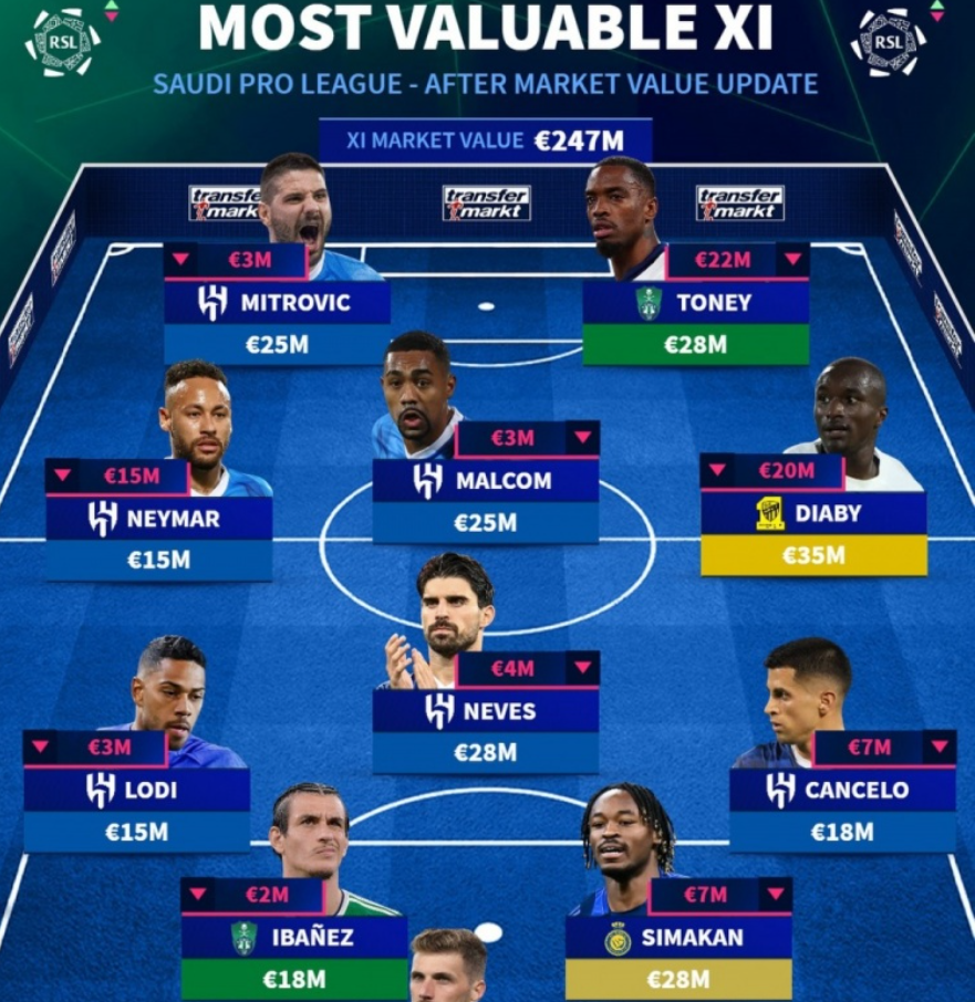 12月14日讯 德国转会市场更新了沙特联赛球员的身价,并列出身价最高阵容,内马尔、米特洛维奇、伊万-托尼在列,总价2.47亿欧元。