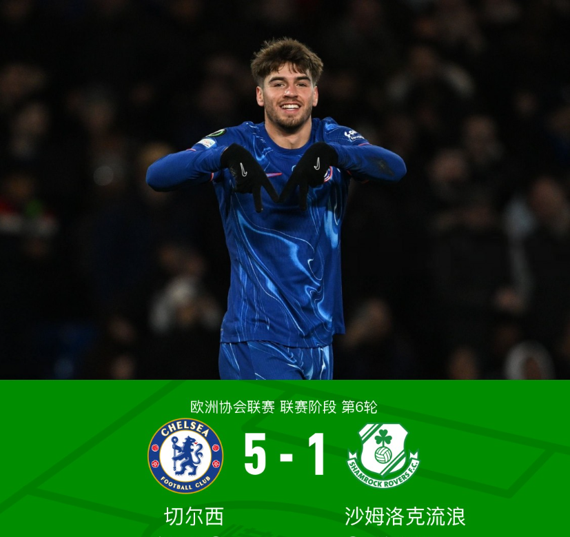 北京时间12月20日欧洲协会联赛 联赛阶段 第6轮,切尔西对阵沙姆洛克流浪。沙姆洛克流浪频繁失误,半场吉乌帽子戏法,迪尤斯伯里-霍尔接恩昆库助攻破门,库库雷利亚右脚低射破门,波姆凌空抽射扳回一城。最终比分切尔西 5-1 沙姆洛克流浪。