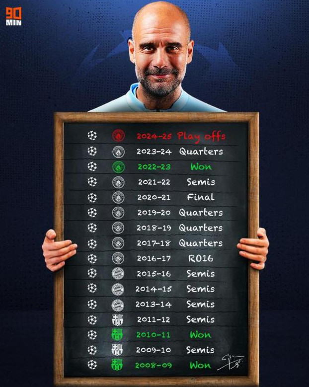 2月20日讯,在欧冠淘汰赛附加赛次回合的激烈角逐中,曼城客场1-3负于皇马,以总比分3-6惨遭淘汰,遗憾无缘16强。此役过后,90minFootball对瓜迪奥拉执教生涯至今的欧冠成绩进行了全面梳理。