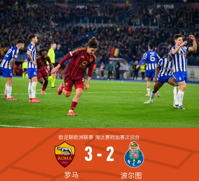 北京时间 2 月 21 日,欧足联欧洲联赛淘汰赛附加赛次回合,罗马与波尔图展开了一场惊心动魄的对决。最终,罗马 3-2 战胜波尔图,以两回合总比分 4-3 成功晋级 16 强。