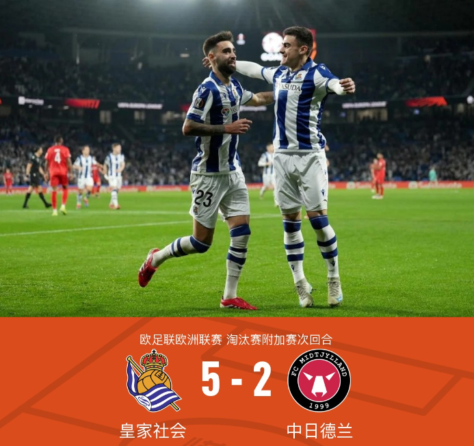 北京时间 2 月 21 日,欧足联欧洲联赛淘汰赛附加赛次回合,皇家社会与中日德兰展开了一场进球大战。最终,皇家社会以 5-2 的比分战胜中日德兰,两回合总比分 7-3 晋级下一轮。