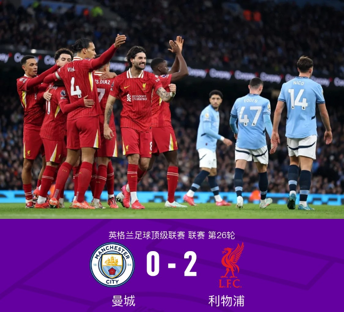 北京时间 2 月 24 日,英超第 26 轮焦点大战在曼城主场伊蒂哈德球场激情上演,曼城与利物浦这对宿敌展开巅峰对决。本场比赛,利物浦凭借萨拉赫和索博斯洛伊的精彩发挥,2-0 击败曼城,完成联赛双杀,让蓝月亮主场蒙羞。