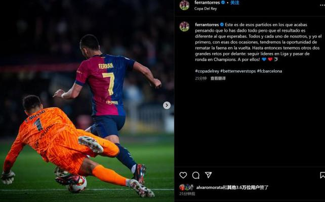 2月26日讯,国王杯半决赛首回合巴萨4-4战平马竞,费兰错失两次单刀机会。赛后他在社交媒体表示:“这是一场竭尽全力却未能收获理想结果的比赛。我们所有人都有责任在次回合完成目标,尤其是错失良机的我。”
