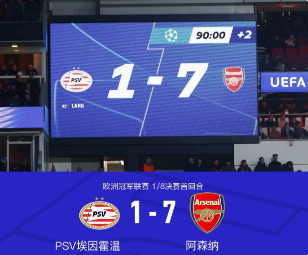 同样是欧冠 1/8 决赛首回合,阿森纳在客场火力全开,以 7-1 的悬殊比分狂胜埃因霍温。上半场,赖斯传中,廷贝尔头球率先破门,紧接着恩瓦内里抽射建功,梅里诺也抓住机会再下一城,虽然托马斯送点,诺阿 - 朗点射扳回一分,但阿森纳已掌握场上主动。下半场开场 2 分钟,阿森纳继续发力,厄德高、特罗萨德先后破门,之后厄德高又远射完成梅开二度,还助攻卡拉菲奥里再进一球,枪手全场 6 人建功,尽显强大实力。