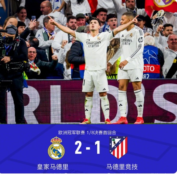 欧冠 1/8 决赛首回合,皇马与马竞上演了一场惊心动魄的马德里德比大战。开场仅仅 4 分钟,巴尔韦德精准直塞,罗德里戈犹如离弦之箭,接球后一路内切,巧妙摆脱防守球员,一脚劲射破门,皇马迅速取得梦幻开局。随后马竞发起反击,阿尔瓦雷斯展现出超强个人能力,成功 1 对 1 突破卡马文加,以一记超级弧线世界波扳平比分,将比赛悬念重新拉回。下半场,卜拉欣 - 迪亚斯成为焦点人物,他在禁区内面对 3 名防守球员,上演穿花蝴蝶步,晃倒吉梅内斯后冷静施射,帮助皇马以 2-1 的比分战胜马竞,在两回合对决中抢占晋级先机。