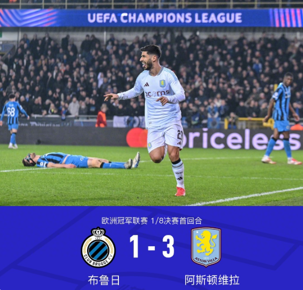 在欧冠 1/8 决赛首回合中,维拉 3-1 战胜布鲁日占得先机。上半场,明斯助攻利昂 - 贝利开场闪击得手,德克伊珀推射扳平比分。下半场,阿森西奥替补登场制造威胁,摩根 - 罗杰斯造成梅切勒乌龙,卡什制造点球,阿森西奥一蹴而就扩大比分。