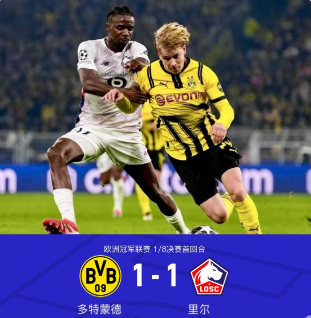 欧冠 1/8 决赛首回合,多特蒙德与里尔展开较量。上半场,阿德耶米先是制造险情,随后贴地斩破门得分,不过格罗斯的进球因越位被吹。下半场,哈拉尔德松为里尔扳平比分,双方最终以 1-1 握手言和。