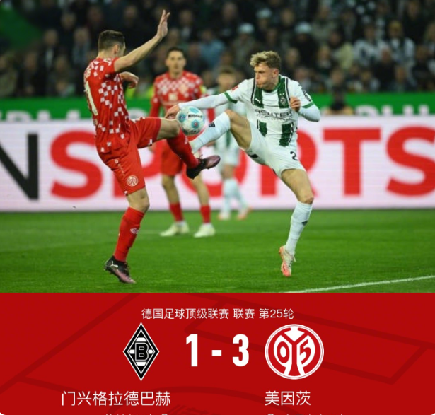 北京时间3月8日,德甲第25轮上演焦点对决,门兴格拉德巴赫坐镇主场迎战美因茨。最终,美因茨凭借出色发挥,客场3-1击败门兴格拉德巴赫,全取三分。
