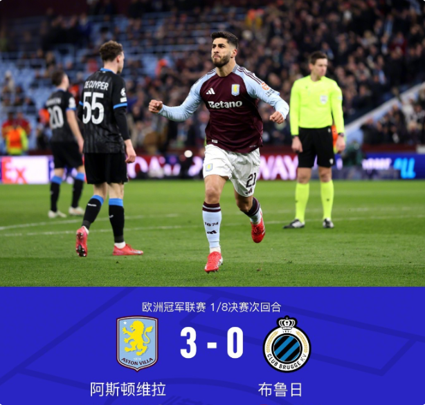 北京时间3月13日,欧洲冠军联赛1/8决赛次回合,阿斯顿维拉主场迎战布鲁日。本场比赛,阿斯顿维拉凭借阿森西奥的梅开二度以及马特森的进球,以3-0完胜布鲁日,两回合总比分6-1淘汰对手,成功晋级下一轮。