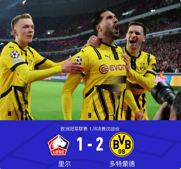 多特蒙德客场挑战里尔。开场仅5分钟,科贝尔出现黄油手失误,戴维打门从其裆下漏入球门,里尔总比分2-1领先。此后多特蒙德攻势不断,格罗斯单刀被挡。下半场,吉拉西制造点球,埃姆雷-詹主罚命中扳平比分。随后拜尔爆射反超,多特蒙德最终2-1逆转里尔,两回合总比分3-2淘汰对手晋级,八强赛将对阵巴塞罗那。