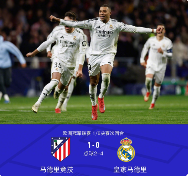 欧冠1/8决赛次回合上演马德里德比,皇马与马竞展开激烈角逐。上半场开场仅27秒,加拉格尔闪击破门,助马竞总比分扳平。此后阿尔瓦雷斯两次劲射,均被库尔图瓦神勇扑出。下半场,姆巴佩制造点球,可惜维尼修斯主罚打飞。加时赛双方均无建树。点球大战中,阿尔瓦雷斯滑倒后二次触球,进球被判无效,巴斯克斯主罚被扑,略伦特击中横梁,皇马最终点球大战4-2、两回合总比分6-4淘汰马竞晋级,八强赛将对阵阿森纳。