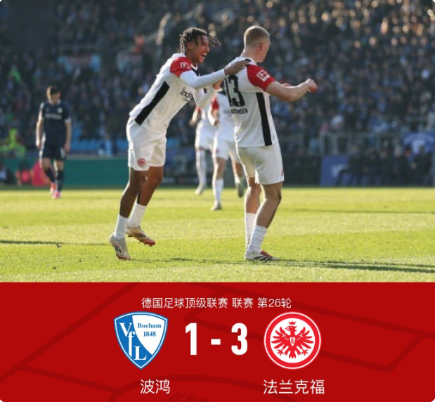 北京时间3月16日,德国足球顶级联赛第26轮赛事中,波鸿在主场迎来与法兰克福的较量。比赛中,法兰克福攻势凌厉,早早掌握场上主动,最终以3-1战胜波鸿。