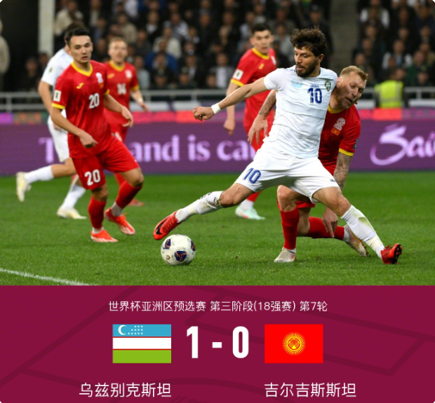 北京时间[具体比赛时间],世界杯亚洲区预选赛第三阶段(18强赛)第七轮上演一场激烈对决,乌兹别克斯坦队与吉尔吉斯斯坦队狭路相逢。比赛过程跌宕起伏,乌兹别克斯坦队凭借阿里若诺夫的制胜球,1-0战胜10人应战的吉尔吉斯斯坦队。