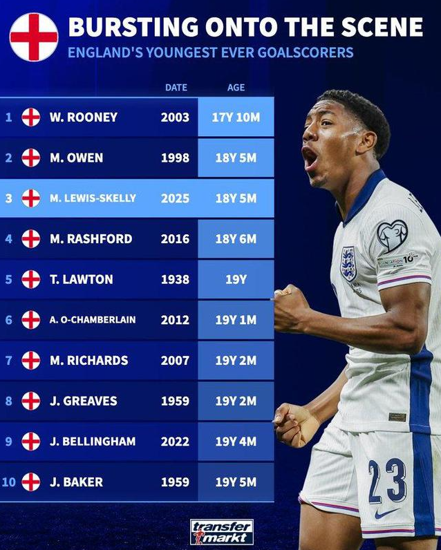 排在斯凯利之后的是拉什福德,他在2016年以18岁6个月的年龄打入英格兰队的首球。其他进入前十的年轻进球者还包括劳顿、张伯伦、里查兹、格里福斯、贝林厄姆和贝克等人,他们的进球年龄都在19岁左右。