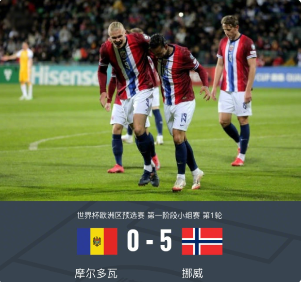 北京时间3月23日,2026世界杯欧洲区预选赛第一阶段小组赛首轮激情上演,挪威队客场挑战摩尔多瓦队。比赛中,挪威队多点开花,进攻火力全开,凭借哈兰德-埃尔林、瑞尔森-马库斯等人的出色发挥,以5-0的悬殊比分大胜摩尔多瓦队,顺利取得开门红。