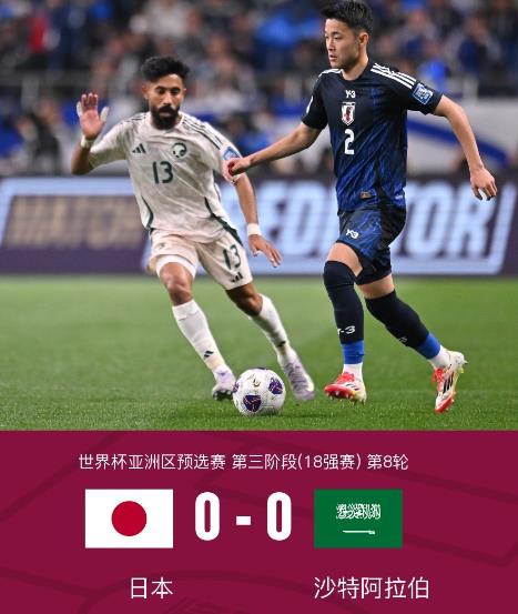 在本次世预赛18强赛第8轮的激烈较量中,日本队与沙特阿拉伯队狭路相逢。两队在场上互有攻守,展开了一场激烈角逐,最终以0-0的比分结束比赛。