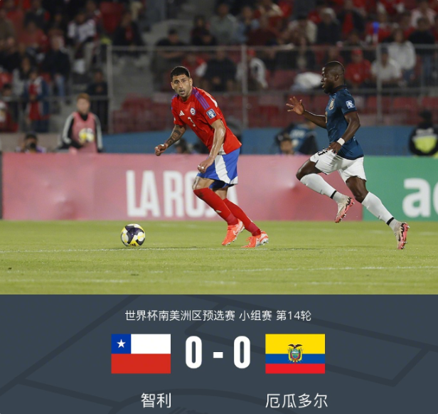 北京时间3月26日,2026年世界杯南美洲区预选赛小组赛第14轮,智利队主场迎战厄瓜多尔队。全场比赛,智利队在控球方面占据优势,厄瓜多尔队则在进攻端颇具威胁,恩纳-瓦伦西亚补时阶段的绝杀进球因越位被取消,最终两队0-0握手言和。