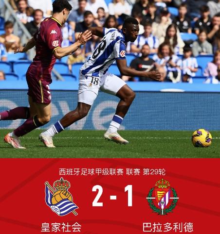 西班牙足球甲级联赛第29轮,一场焦点对决在皇家社会的主场打响,对阵双方为皇家社会和巴拉多利德。此役,皇家社会多点开花,奥亚萨瓦尔、塞尔希奥-戈麦斯先后破门,尽管巴拉多利德在比赛末段由拉塔萨扳回一城,但皇家社会还是以2-1锁定胜局。