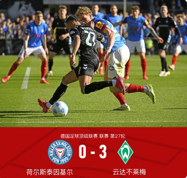 北京时间3月29日,德国足球顶级联赛第27轮展开激烈角逐,荷尔斯泰因基尔队主场迎来云达不莱梅队的挑战。全场比赛,云达不莱梅队凭借杜克施、阿古和格吕尔的进球,以3-0的比分完胜荷尔斯泰因基尔队,全取三分,在积分榜上进一步巩固了自己的位置。