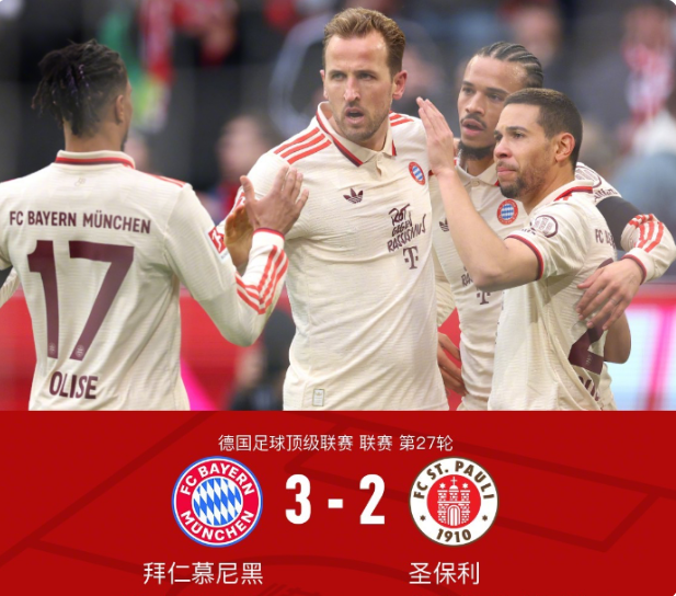 北京时间3月29日,德国足球顶级联赛第27轮迎来一场焦点对决,拜仁慕尼黑队坐镇主场迎战圣保利队。全场比赛跌宕起伏,拜仁慕尼黑队凭借凯恩-哈里的传射以及萨内-勒罗伊的梅开二度,以3-2的比分险胜圣保利队,艰难收获三分。