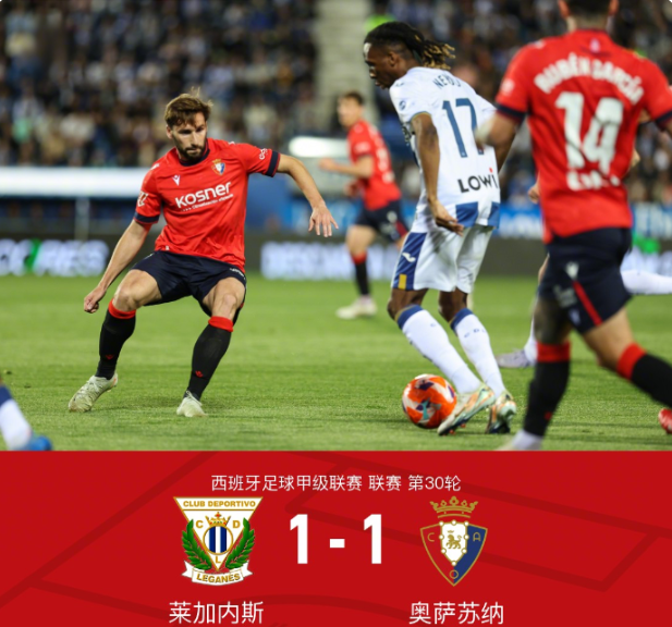 全场比赛结束,莱加内斯与奥萨苏纳以1-1的比分结束战斗。这场平局对于两队在西甲积分榜上的排名可能会产生一定影响。